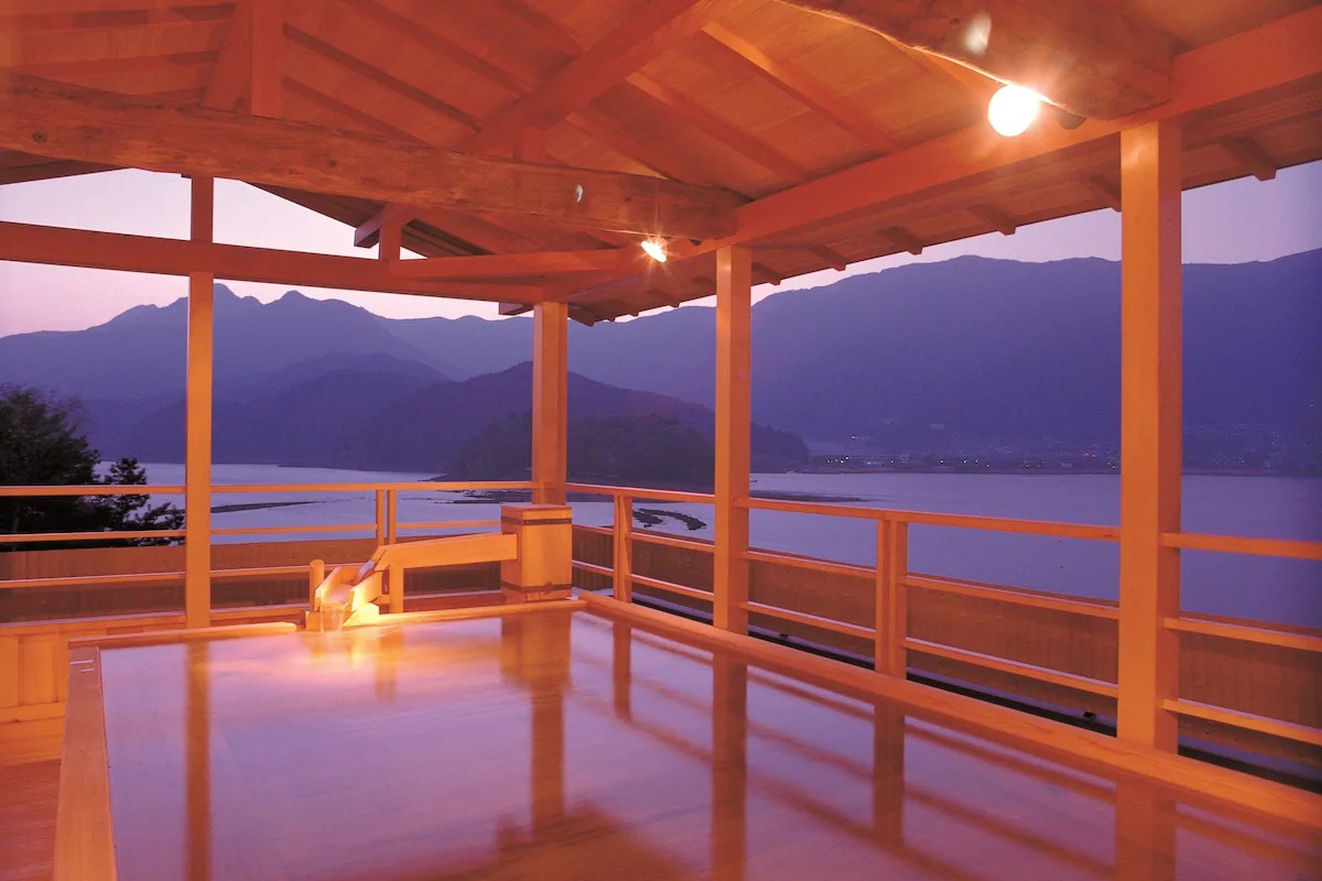 露天風呂に浸かりながら富士山と河口湖を眺めることができます。夜は煌びやかな街並みと星空も同時に楽しめてついつい長湯に。