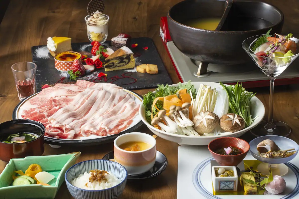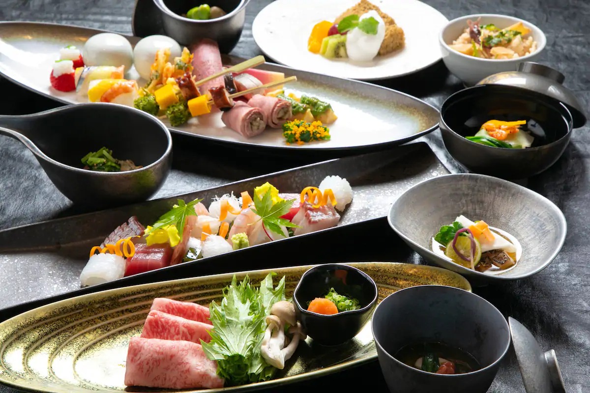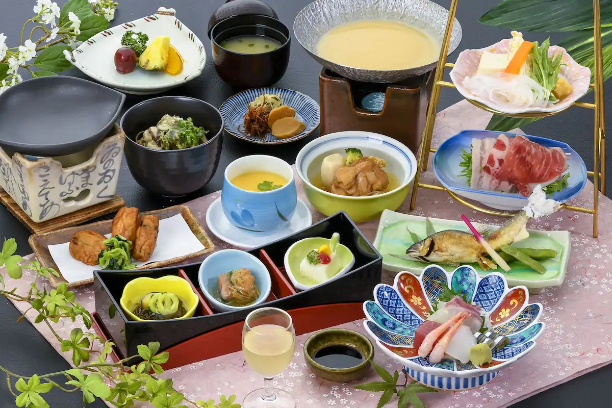 鹿児島黒毛和牛、黒豚、さつま揚げ、錦江湾産鯛など霧島の食材をふんだんに使った会席を味わうことができます。