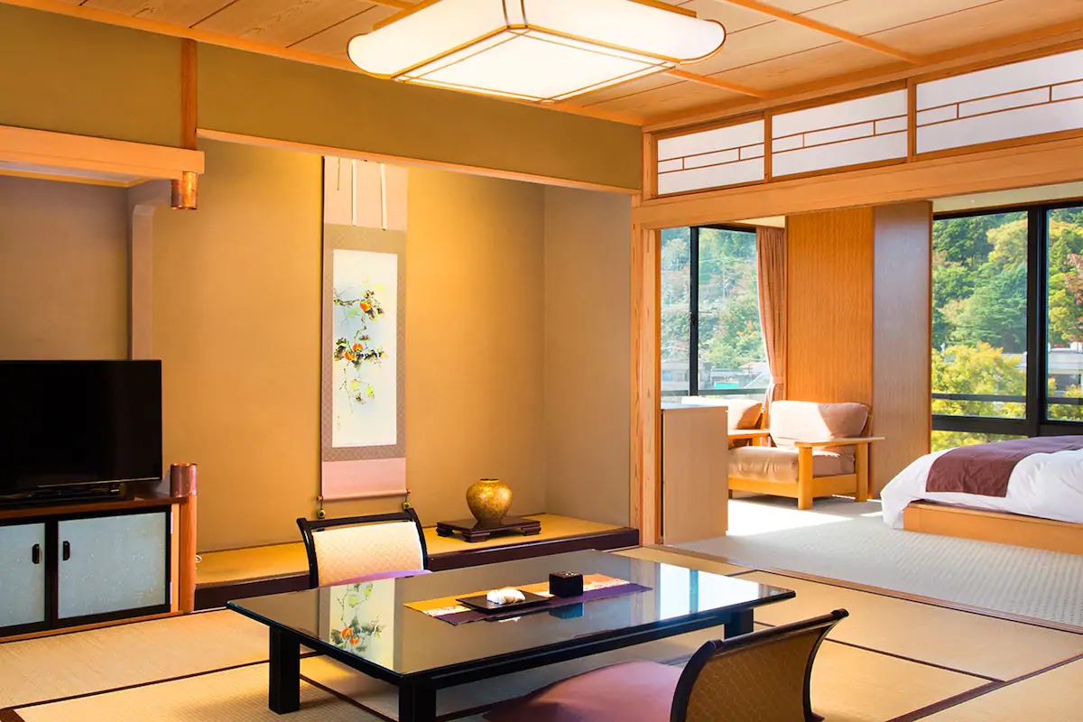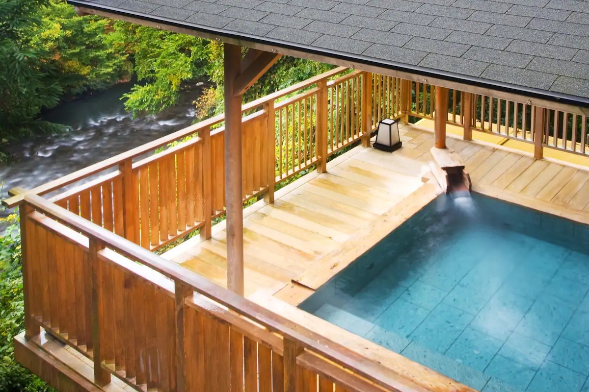 自慢の展望風呂からは、雄大な鶴仙渓を一望できます。四季折々の景色を楽しみながら、ゆったり温泉を堪能できるおすすめの宿!