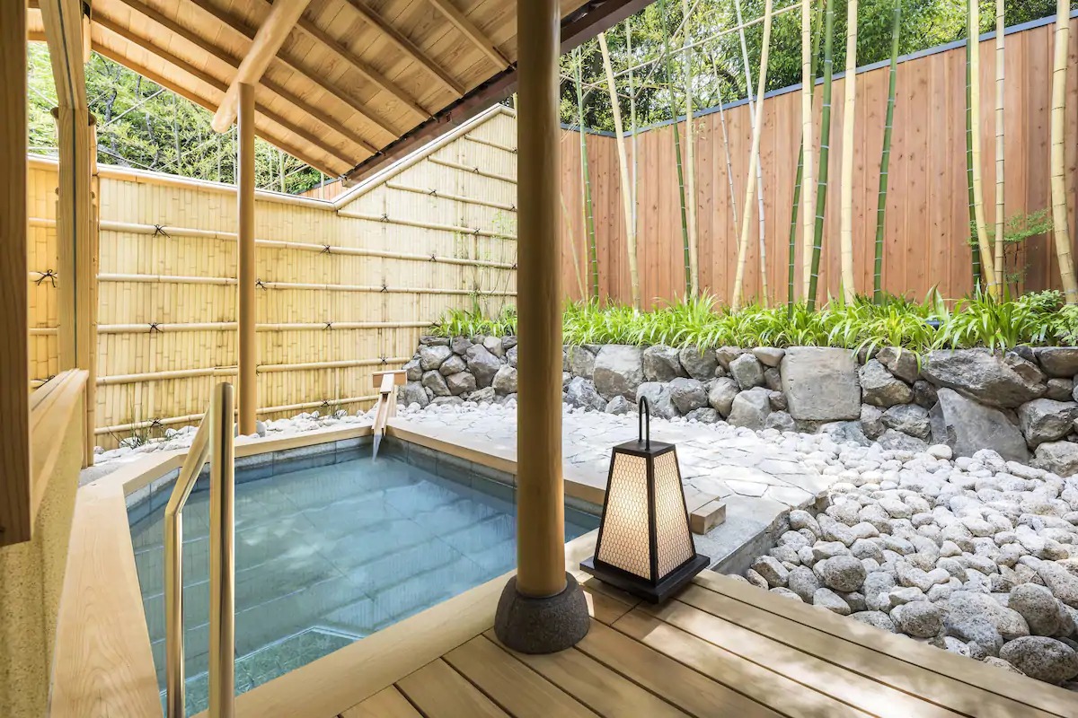 日本庭園「竹音の庭」をながめながらつかる、貸切り温泉露天風呂で目覚めのひと時を。