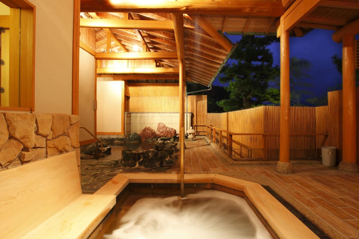 湖から心地よい風が届く庭園露天風呂で、旅の疲れを癒やす