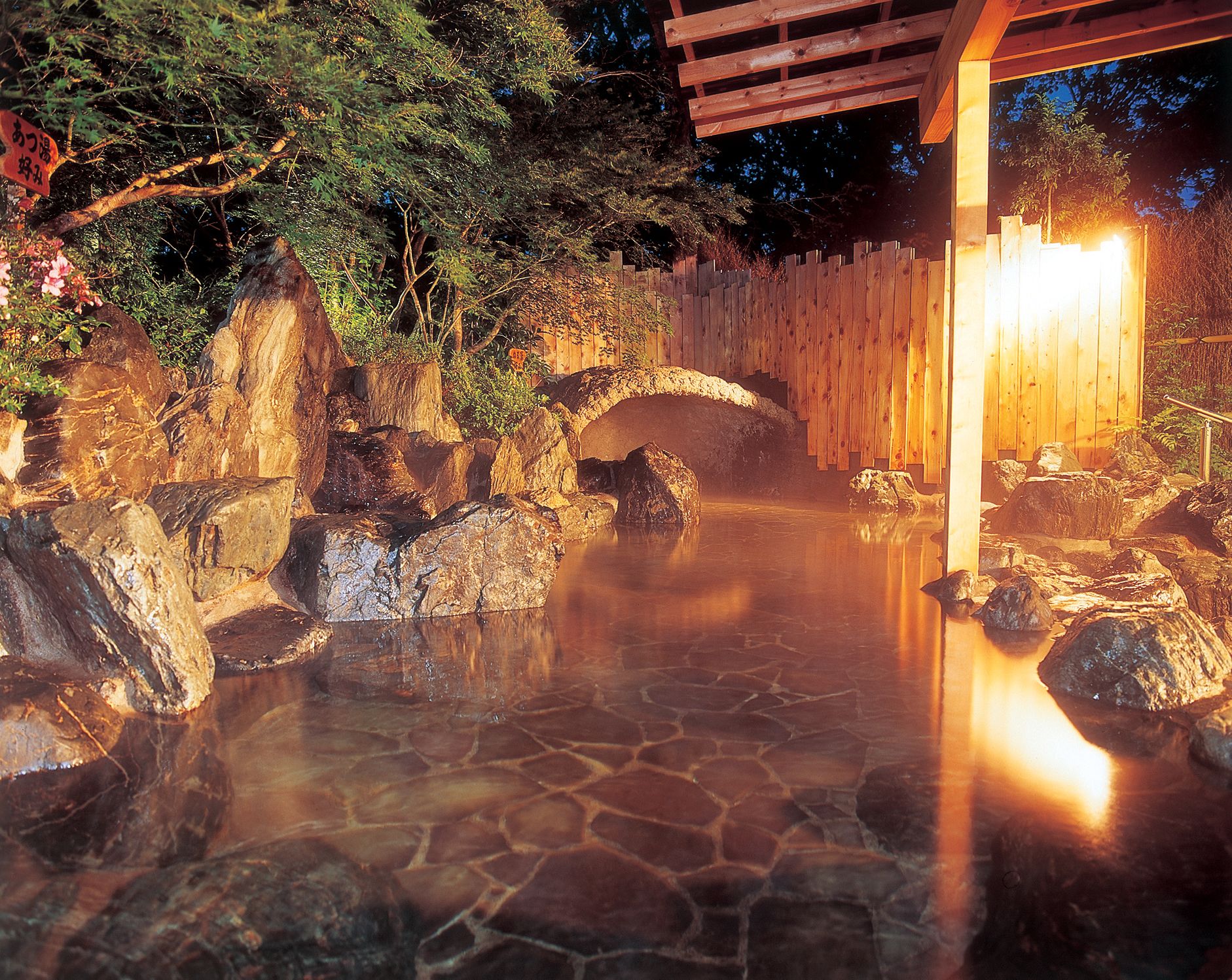 露天風呂や貸切風呂、岩盤浴のような「マイナスイオンサウナ」など、豊富な温浴施設が揃います。大浴場・露天風呂はそれぞれ2ヵ所、貸切風呂は3ヵ所あり、湯巡りにも◎