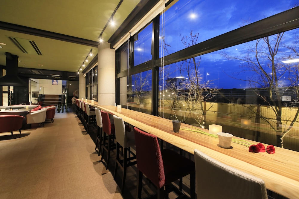 バーカウンターでは、清流に沈む夕日とともに地酒をゆっくり楽しめます。