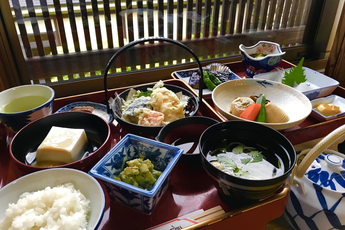 精進料理とは、肉や魚などを使用しない料理のことです。天ぷらなどは出来立てを味わえます。