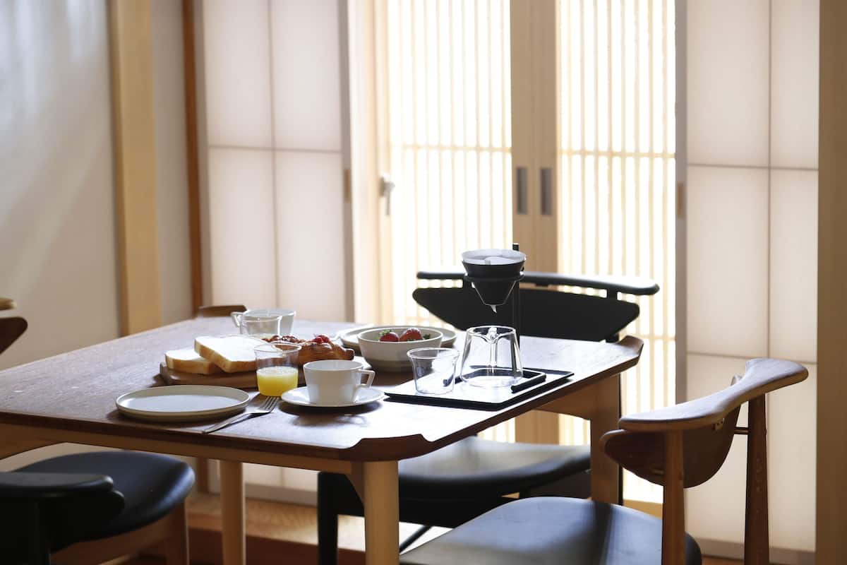 朝食は、商店街の新鮮な食材を買って、自炊するのがおすすめ!客室内のキッチンには、簡単な調理道具や電子レンジなどが揃っています。