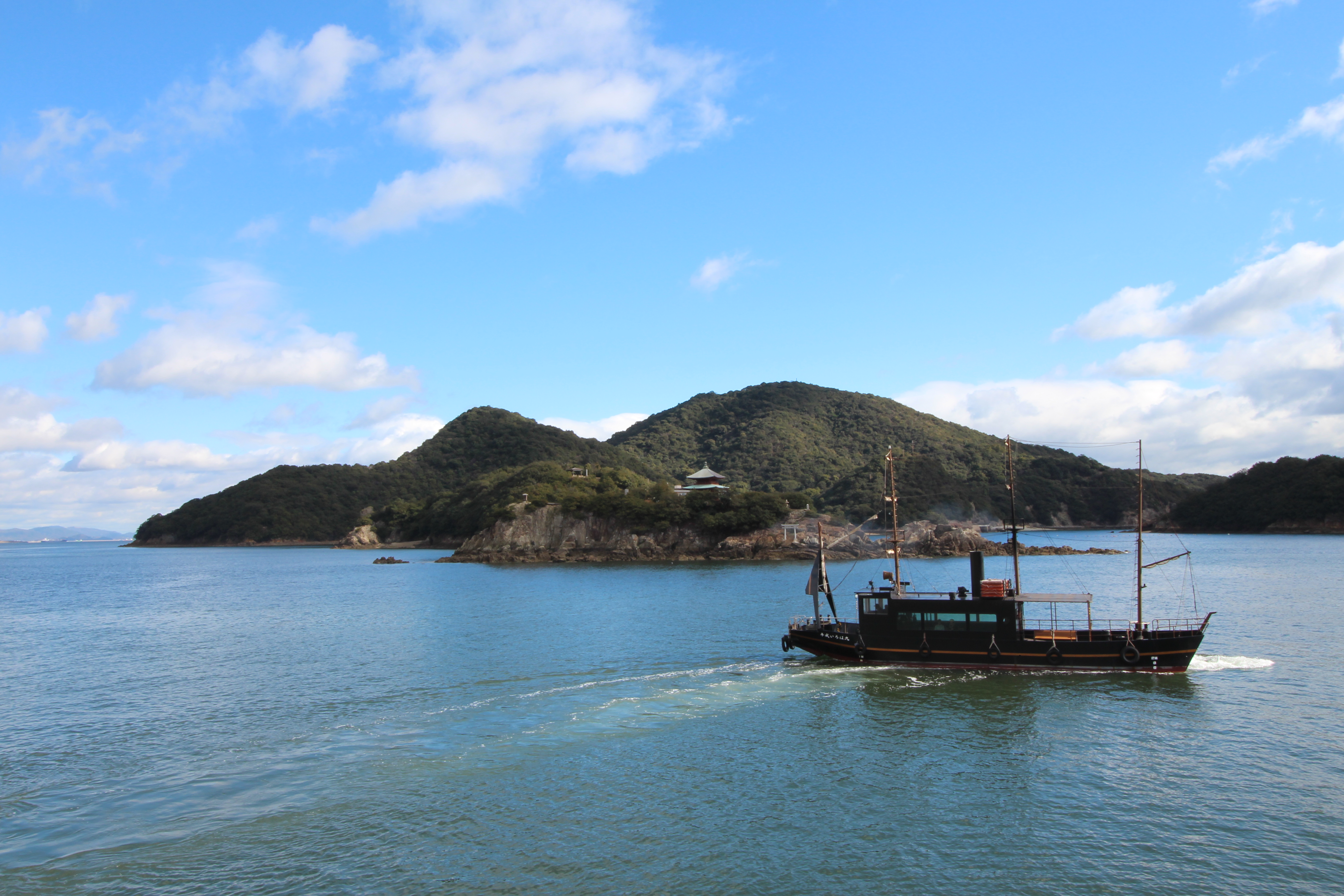 市営渡船「平成いろは丸」に乗って、5分ほどで到着します。
