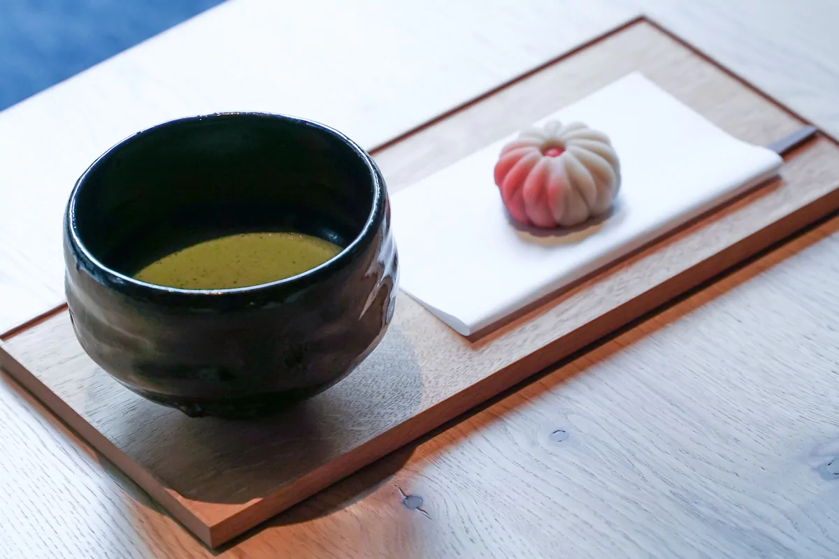 館内にあるティーサロンで、お抹茶と和菓子を満喫。工作家・中田雄一や杉田明彦の美しい器を楽しめます。