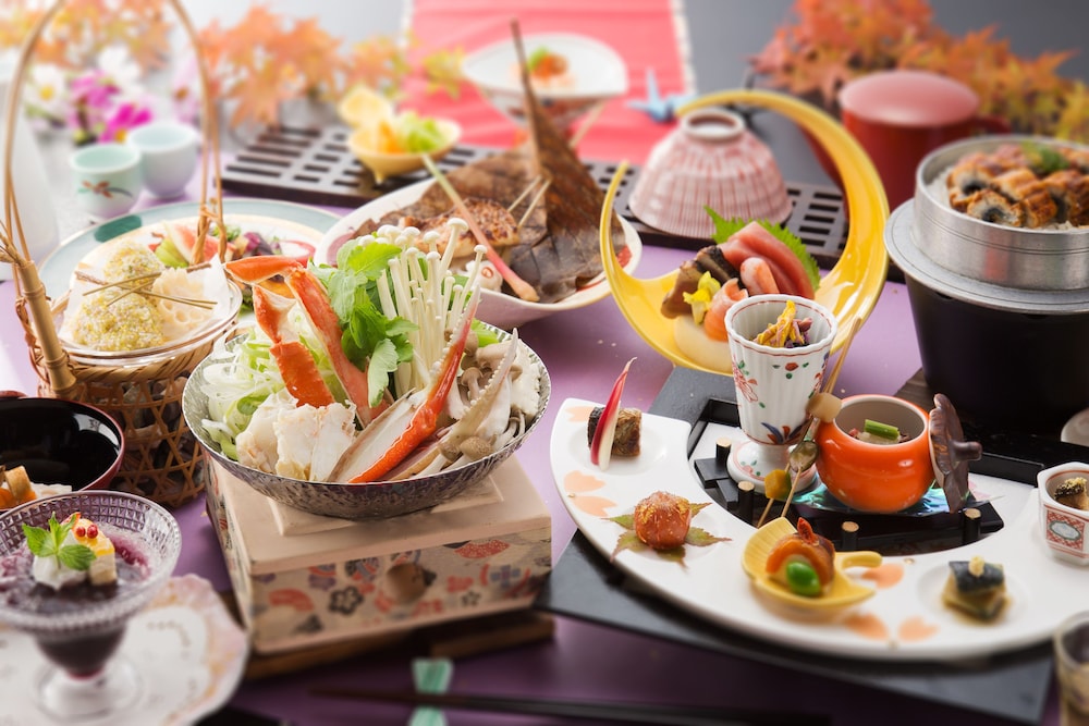 山菜や海の幸を贅沢に盛り込んだ、季節の会席料理を味わえます。