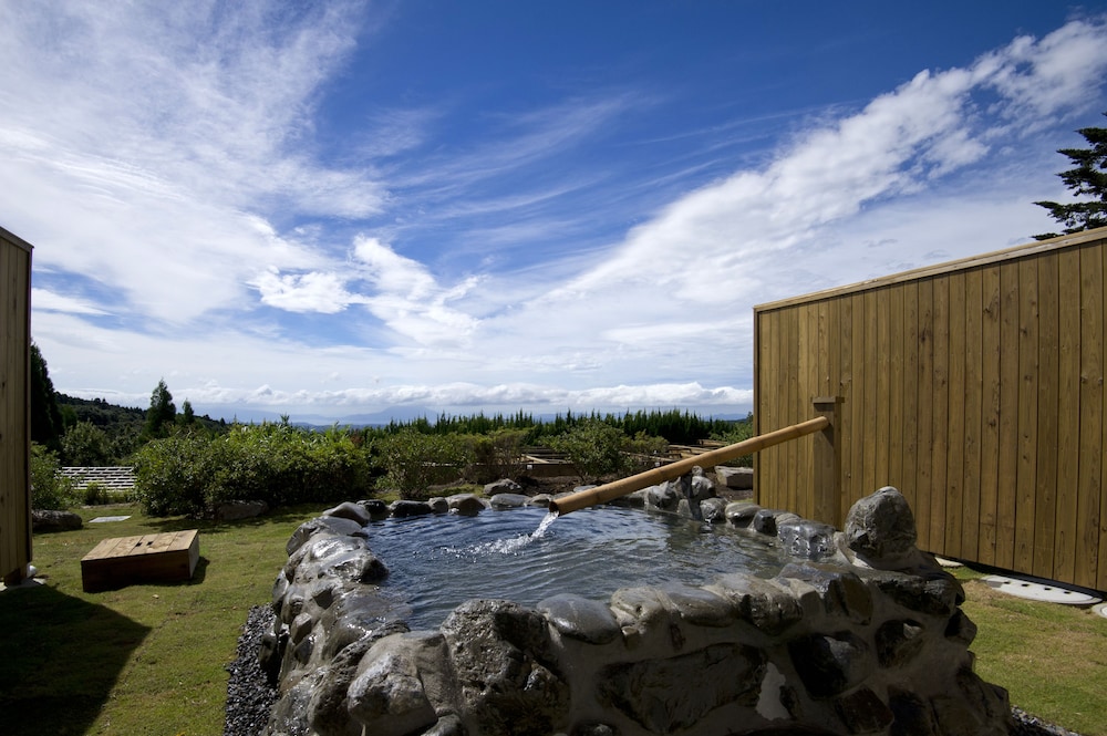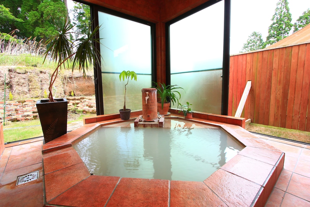 岩をくりぬいた湯船や壺湯など、異なる設えのお風呂で温泉を楽しめます。少し熱めのお湯に浸かって、身体がすっきり目覚めていくのを感じましょう。