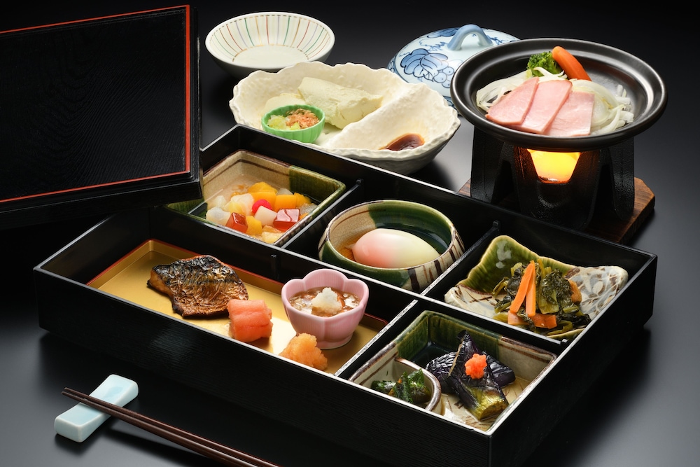 朝食は、庄内産の焼豚や温野菜、山菜の小鉢などやさしい味わいの和定食を楽しめます。山形のブランド米「つや姫」は絶品です。
