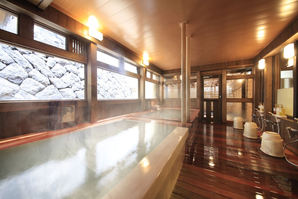 お風呂には、足触りのよい木造りの床が敷いてあります。木の香りに癒やされながら、ゆっくり温泉を堪能できるおすすめの宿です。