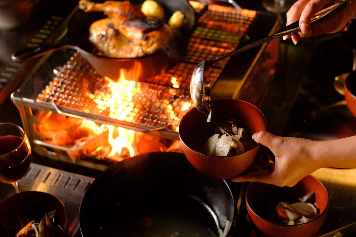 炭火で作るアウトドア料理は絶品。有機地鶏のローストチキンや、旬の野菜を使ったオイスターソース炒めなど、多彩なメニューを楽しめます。