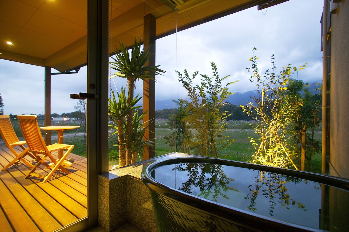 自然との一体感を感じる客室が魅力です。テラスを1歩出ると、目の前には癒やしの田園風景が広がります。