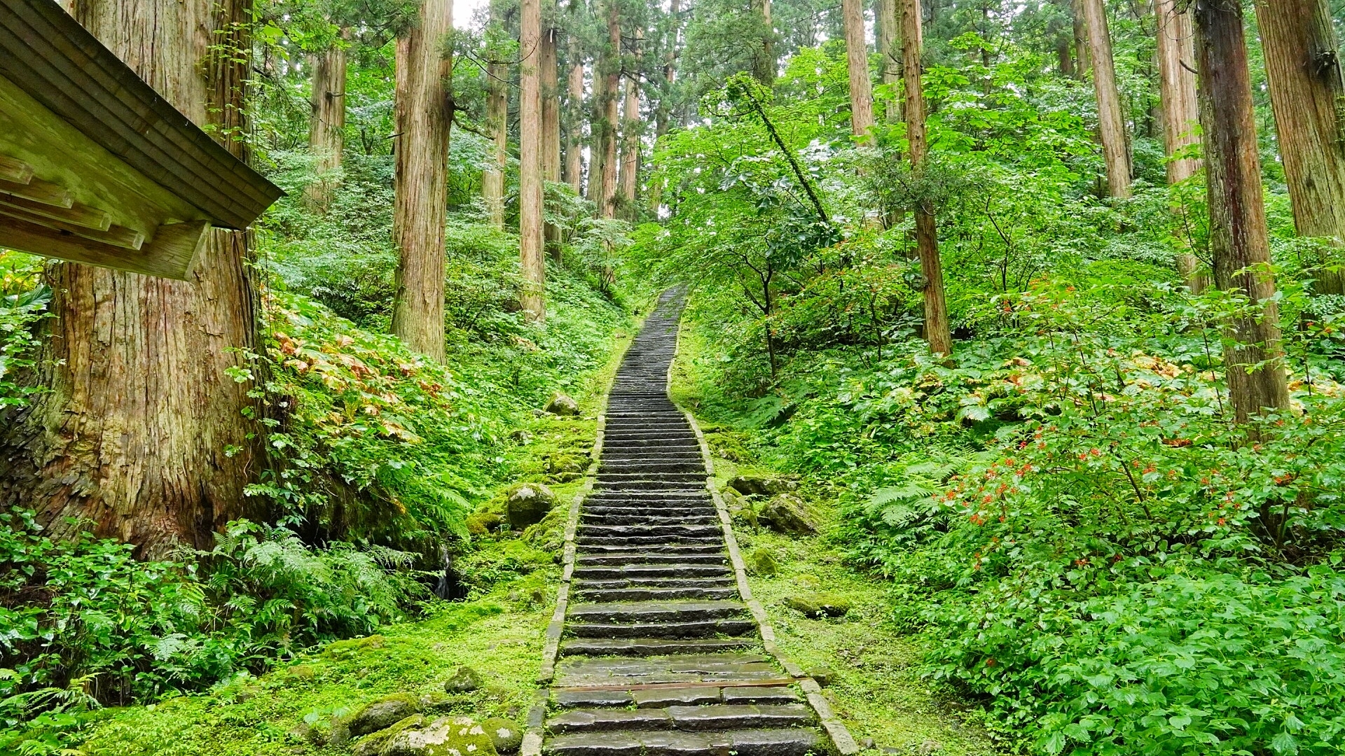 樹齢300年を超える杉並木に包まれた石畳の坂を登ります。2,446段のうち33個の石段に絵が彫られているので、探しながら進むのがおすすめ◎途中に、田園が広がる庄内平野を見下ろせる茶屋があり、ひと休みできます。