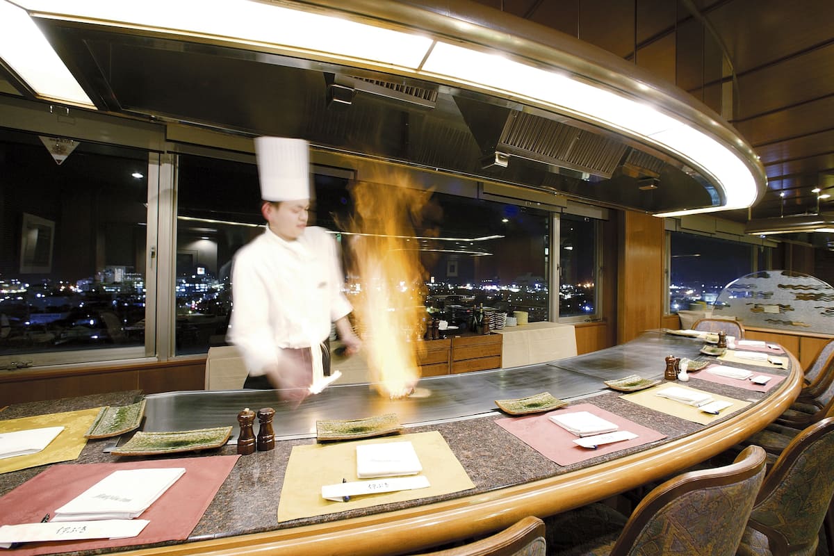 最上階の眺望を楽しみながら、目の前の鉄板で調理される近江牛を堪能できます。