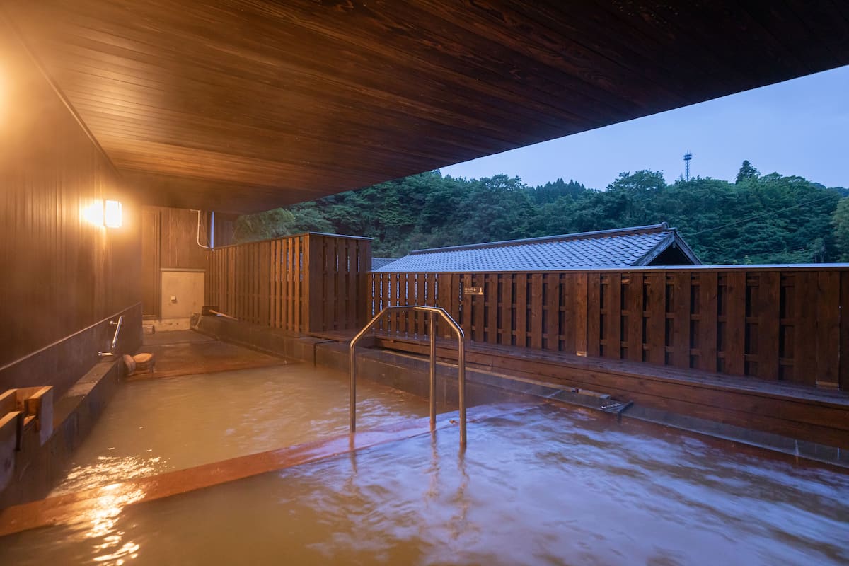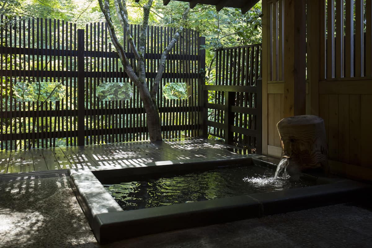 広大な落葉樹林の中に、ひっそりと佇む旅館「山河」。敷地内には露天風呂をはじめ、桶風呂や貸切風呂など7つの湯船で温泉を堪能できます。