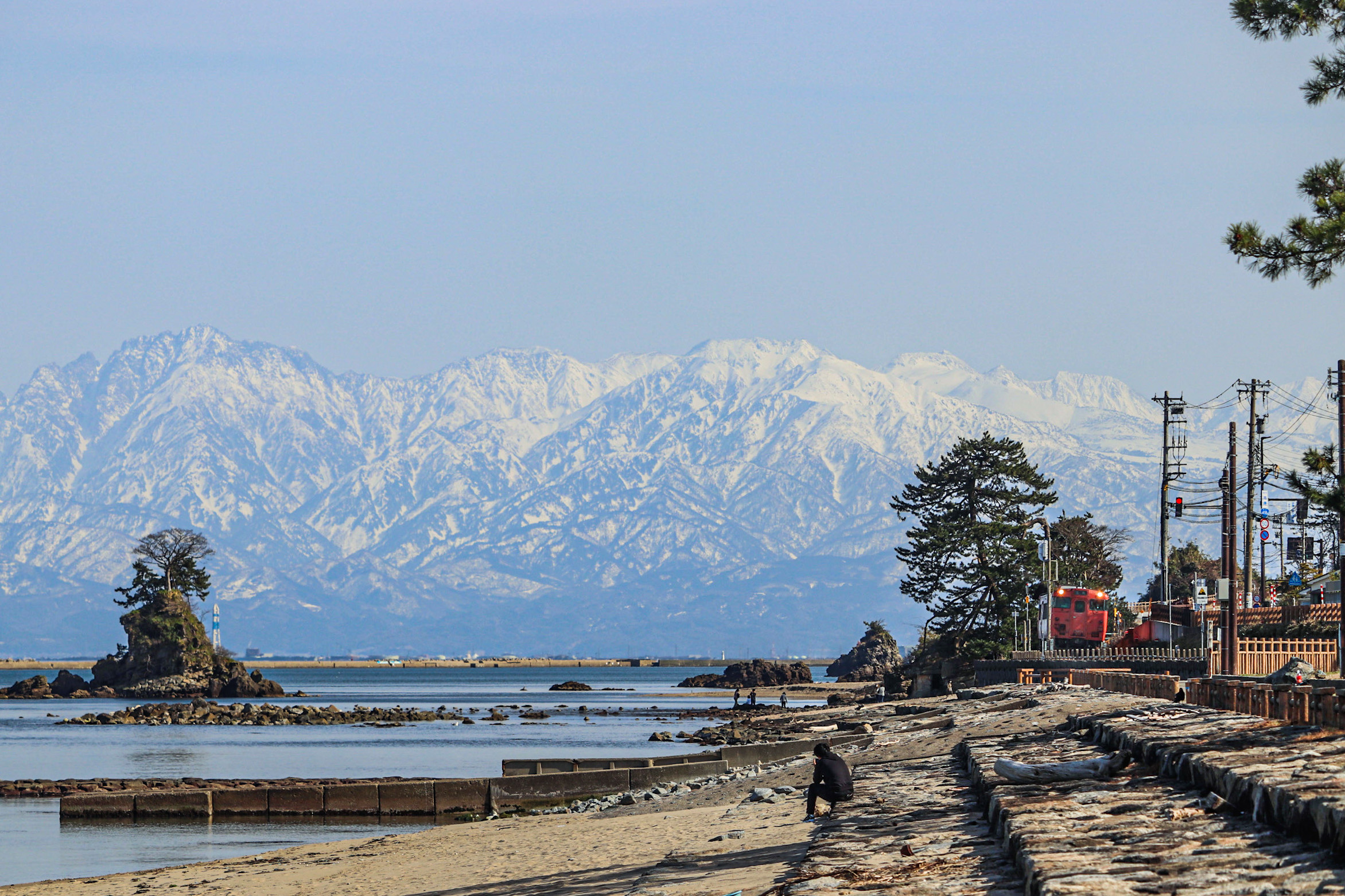 土日限定で運行している「ベル モンターニュ エ メール」がおすすめ。車内には沿線の伝統工芸「井波彫刻」が施された展示や「高岡銅器」をイメージしたつり革があり、ギャラリーのような雰囲気を楽しめます。富山の海の幸や地酒を味わいながら、雪化粧した美しい街並みや雨晴海岸などを眺める贅沢な電車の旅が楽しめます。