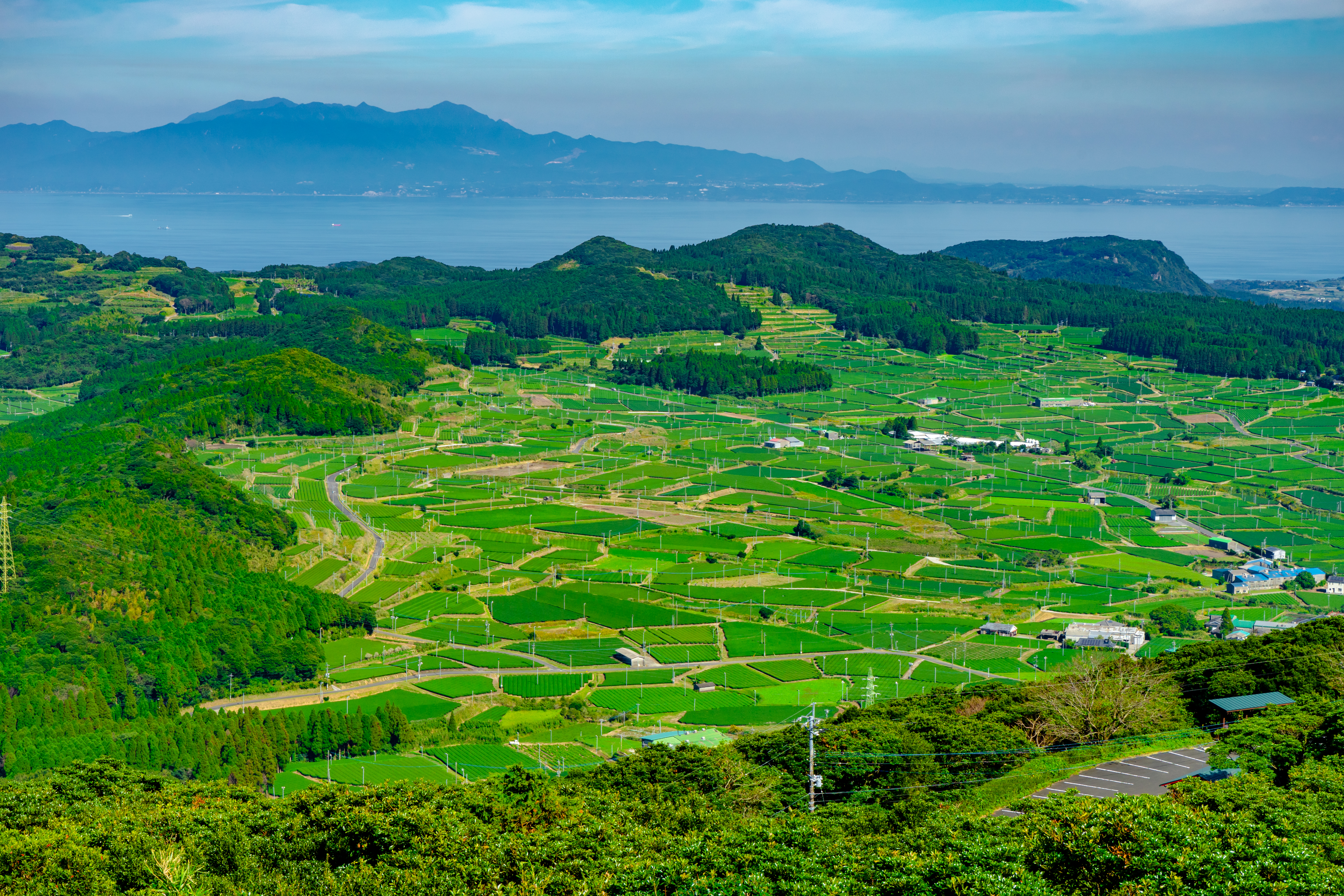 次のスポット「番所鼻自然公園」までは、レンタカーで45分ほど移動します。途中、薩摩を一望できる「大野岳公園」に立ち寄るのがおすすめ。360度大パノラマの絶景を楽しめます。