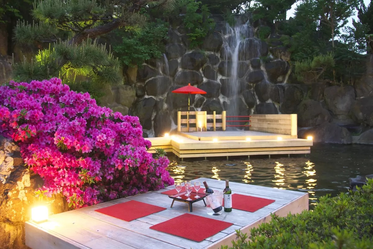 庭園で飲食を楽しめる温泉宿
